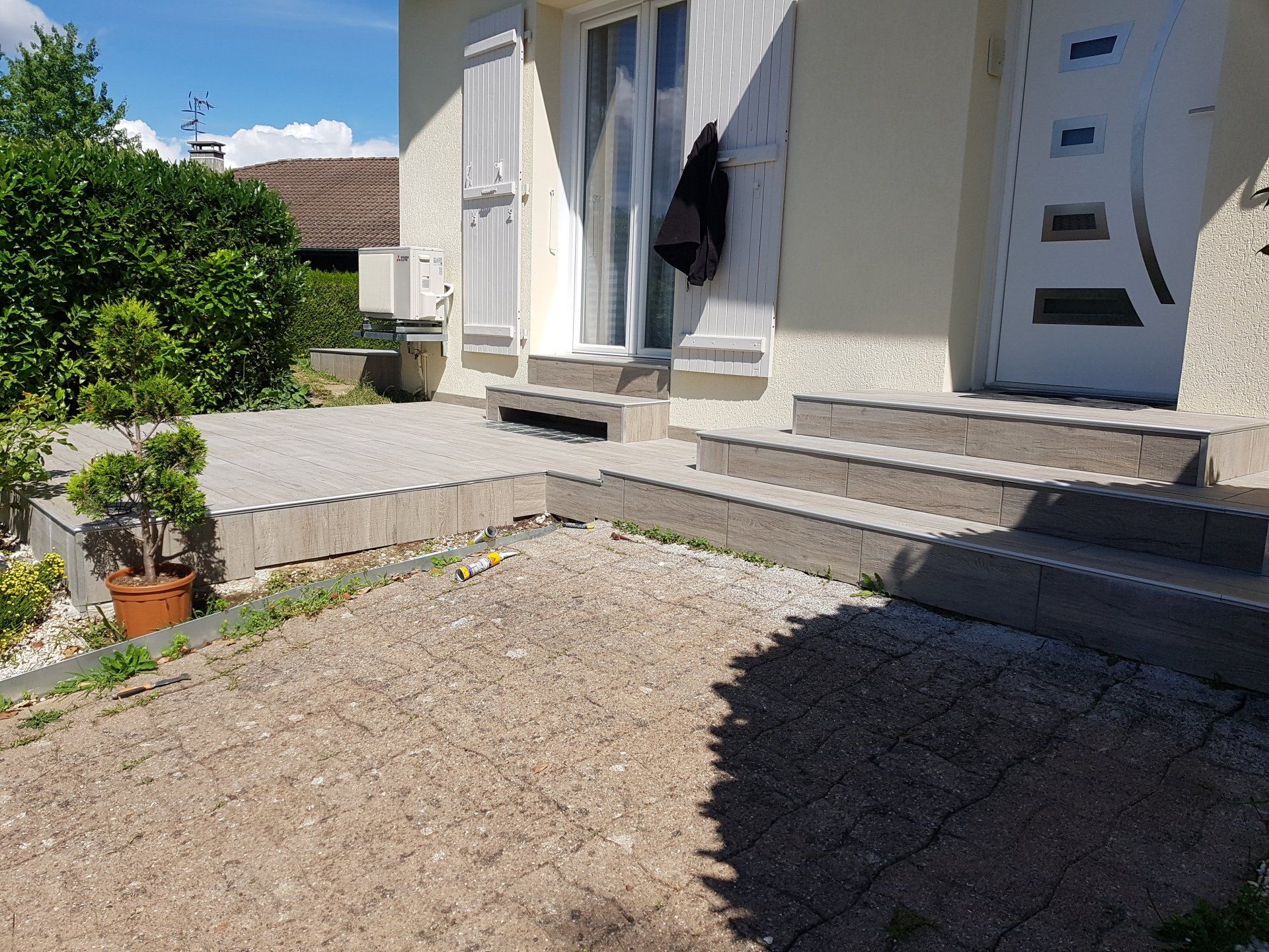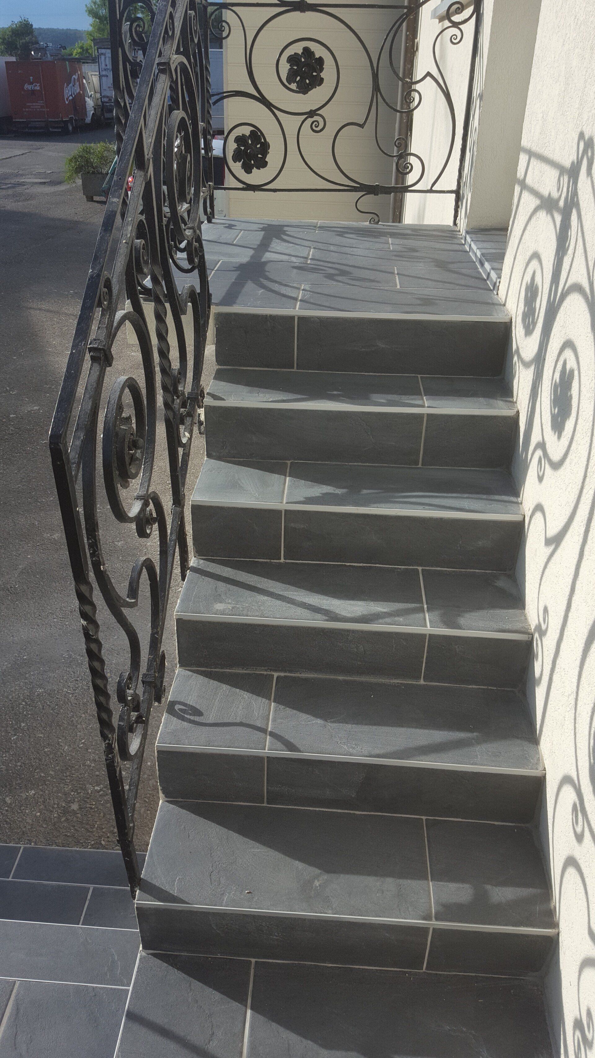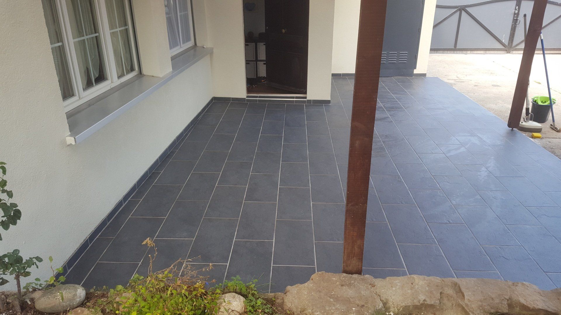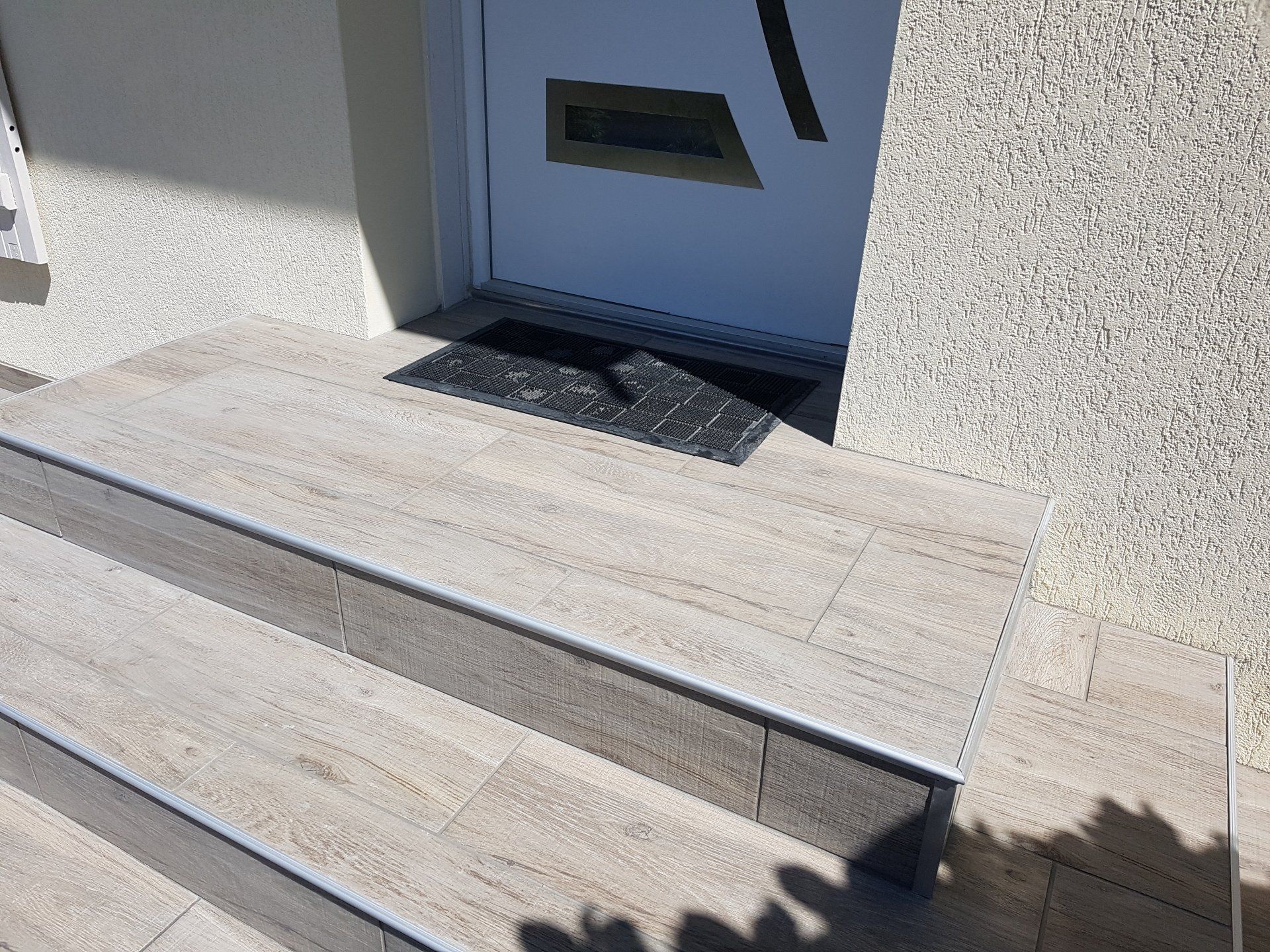 Pose de carrelage sur une terrasse et un escalier, avec baguettes de finition en aluminium.