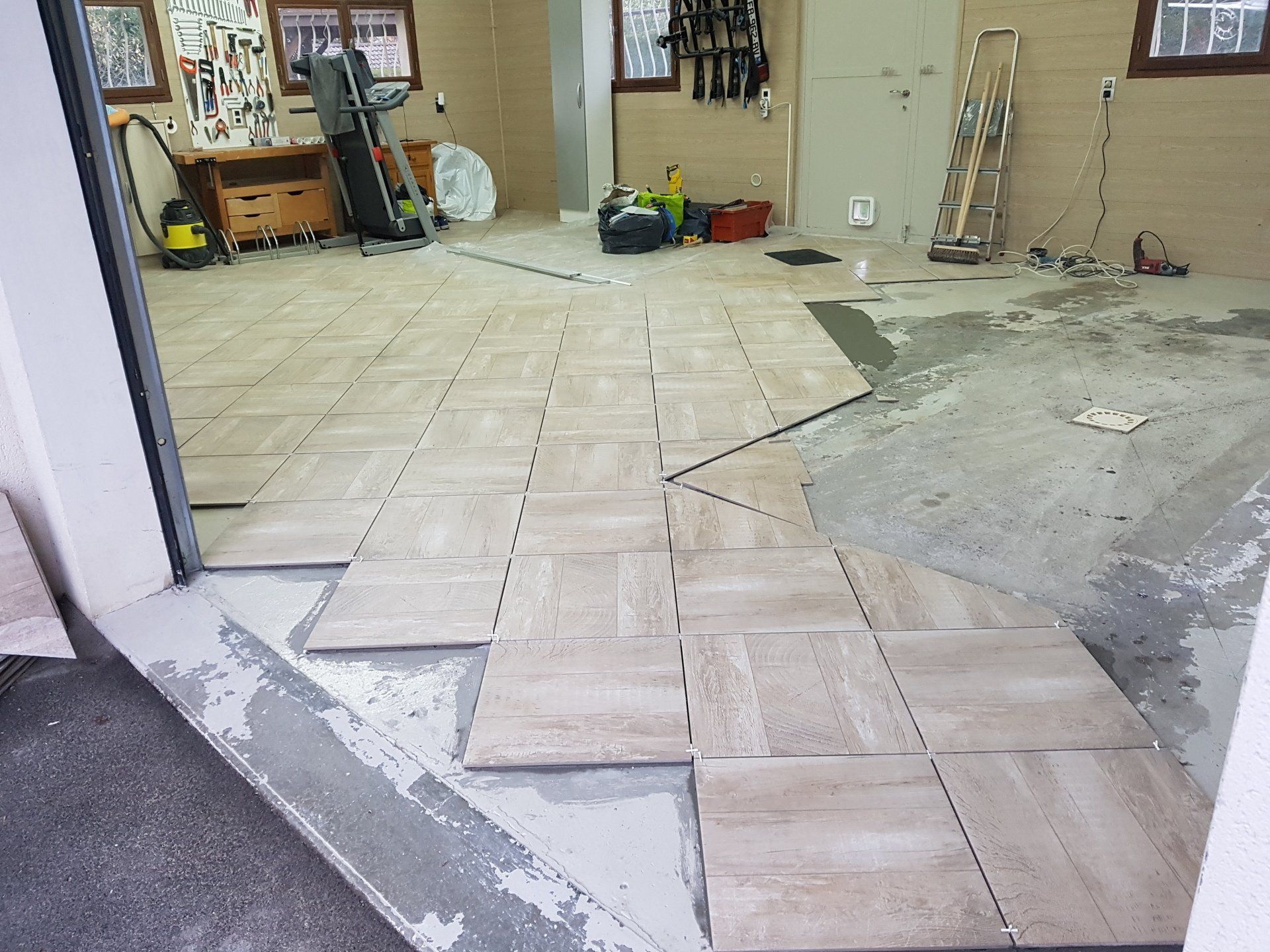 Pose de carrelage en diagonale dans un garage, avec une partie en pointe de diamant autour du syphon.